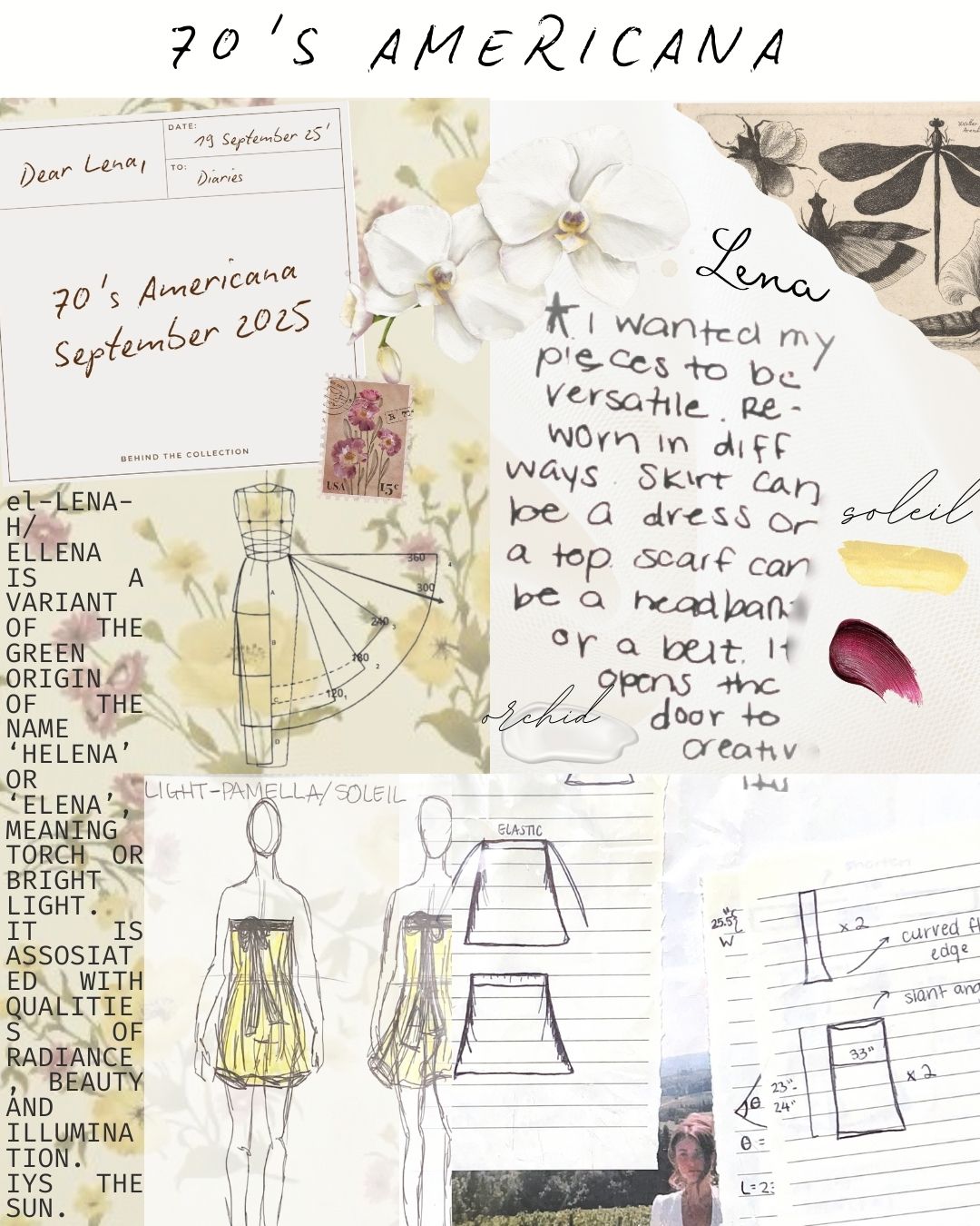 Welcome to my internal sketchbook. And also, how could I forget, welcome to LENA! I'm so happy you found your way here. I wanted to create a space where I could share my concepts, inspirations, and motives behind my designs. Welcome to story time. By the way, my full name is Ellena, which in Latin origin is defined as "bright one." Hence the Soleil and beautiful daisy, and soft honey butter colorways. So, 70's Americana. This collection is one I hold close to my heart, not plainly because it is my first launch, but because it represents my vision for my brand as a whole. The footprint that inspires my whimsical, free spirited, and "one-with-the-wind" nature. Relaxed, loosely fitted, and playful backbones and silhouettes. I take a lot of my inspiration form the 70's, western styles and their eclectic nature. Its fun and refreshing, but still modernized in a way to be wearable among many.